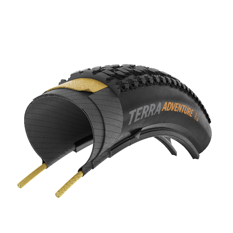 Terra Adventure features sidewall and center reinforcement for puncture protection and state-of-the-art tubeless-ready technology and hookless compatibility.