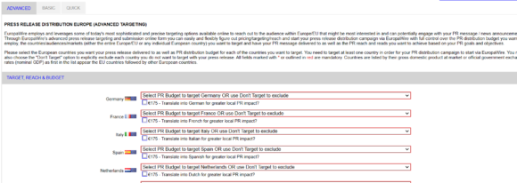 La forma más sencilla de conocer precios, segmentación y alcance, y de iniciar su campaña de distribución de notas de prensa a través de EuropaWire con pleno control del presupuesto PR que desea emplear, de los países/audiencias/mercados (ya sea toda Europa/UE o cualquier país europeo en particular) que desea seleccionar y a los que quiere hacer llegar su mensaje PR, así como del alcance y lecturas que desea obtener en función de sus objetivos PR, es visitar el formulario online avanzado de segmentación y envío PR de EuropaWire en: