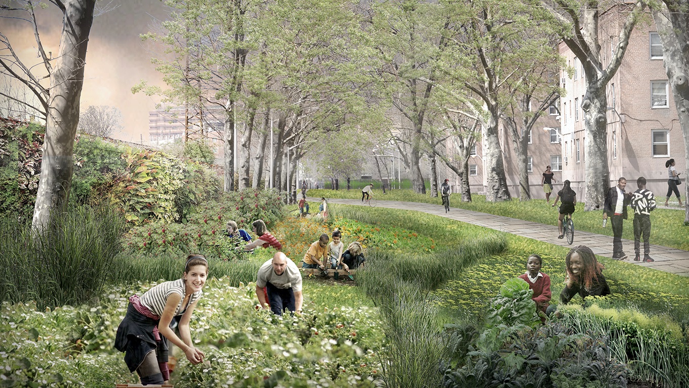 Alineadas con el enfoque de Copenhague, las nuevas inversiones permiten que NYC DEP instale métodos innovadores y adaptables que absorben, almacenan y transfieren aguas pluviales para evitar inundaciones durante una tormenta. Esto incluye incorporar infraestructura gris y verde, así como espacios abiertos, para almacenar el exceso de aguas pluviales. Estos proyectos piloto de resiliencia incorporan varios planes destinados a mitigar futuros eventos climáticos extremos que se pronostica que traerán hasta 5,842 cm (2,3 pulgadas) de lluvia por hora, así como fortalecer los vecindarios contra el cambio climático.